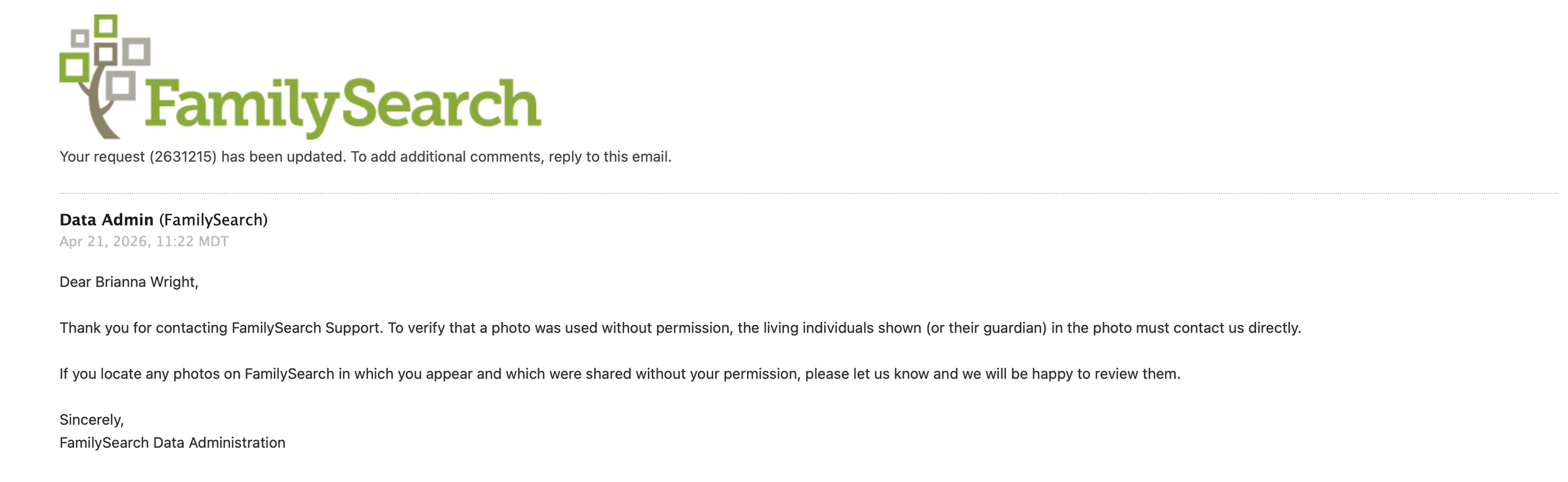 Imagine my frustration at the lackadaisical response given by FamilySearch, shared below, at my request they remove the photos as they all contained images of living relatives. Most shocking of all, some of these photos were of my mother with her grandchildren, that had been shared privately to family members alone.